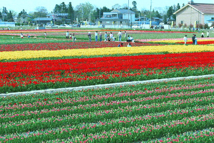 今年のチューリップの場所は1998年の場所と同じのですが、駐車場の場所とチューリップの即売の場所が変更になっています。土手沿いの道に路上駐車するよう看板が出ています。農協の??倉庫前の駐車場も使えるようですが。